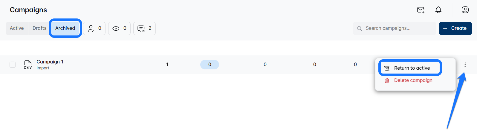 Simply switch to the 'Archive Campaigns' view. Youโll now see all your neatly tucked-away campaigns.