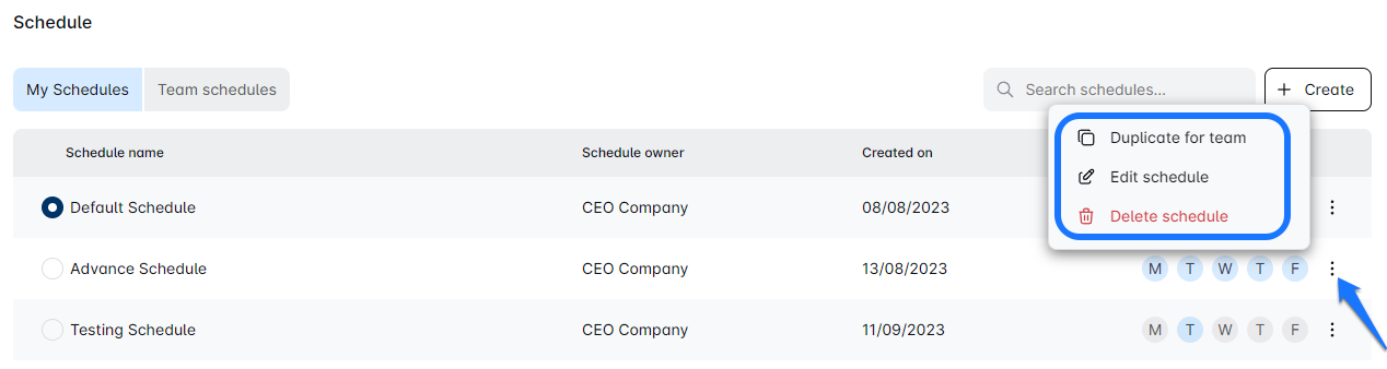 Within the three-dot menu, you can 'Duplicate for team', 'Edit schedule' or 'Delete' a schedule as needed.