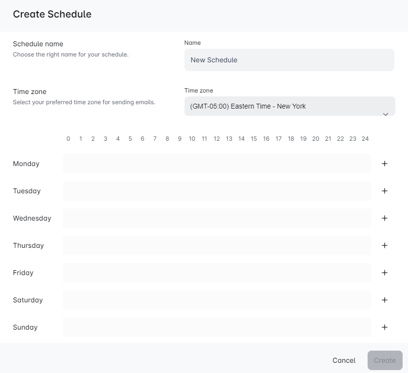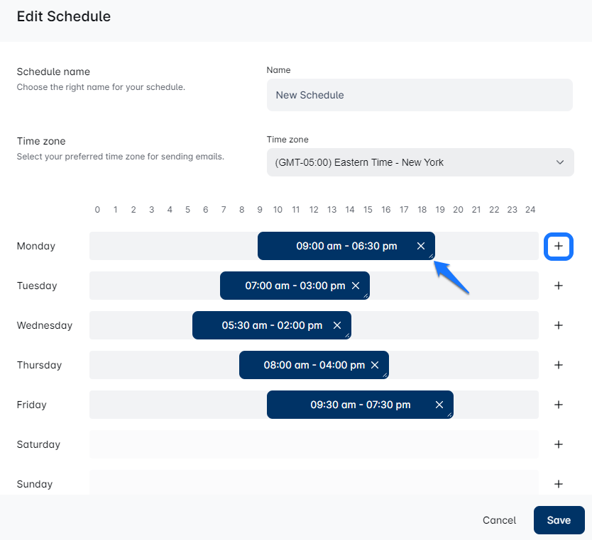 Use the plus icon to define the hours for sending emails.