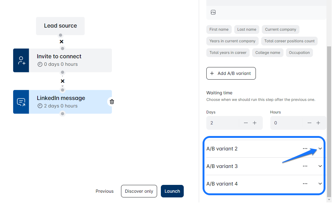 - In Luna Bella Media, you can test different parts of your message copy, such as LinkedIn messages, Emails, InMails, Invites to Connect, or even the timing between the steps during the campaign sequence creation process. You can create up to 5 different test variants!