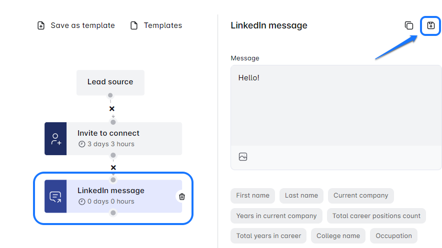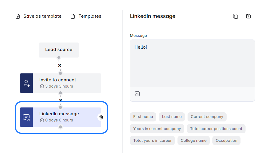 Save time with the Luna Bella Media’s step copy-and-paste feature! Easily duplicate steps like Invites, Messages, or Emails, and customize them in sequence. Save key steps as templates in the Template Library for future campaigns. Streamline your workflow and boost efficiency! 🚀 Need help? We’re here for you.