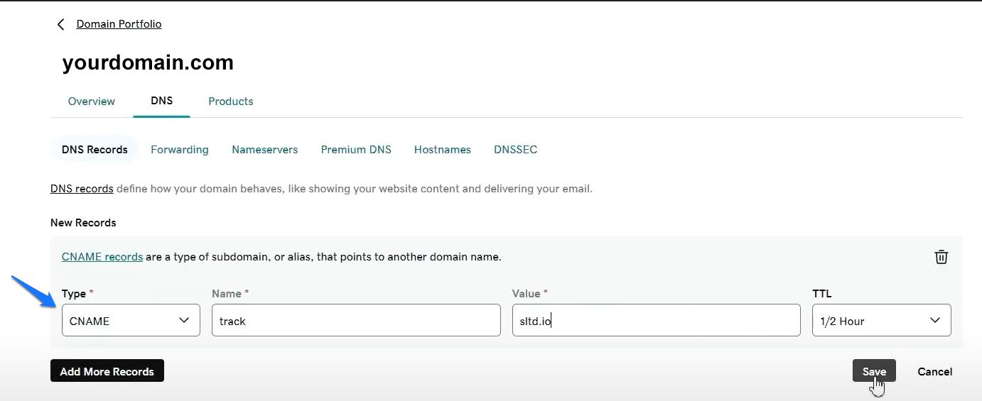 - This time, under record type in the dropdown menu, find CNAME, and paste the details provided in Luna Bella Media’s Custom tracking domain settings.